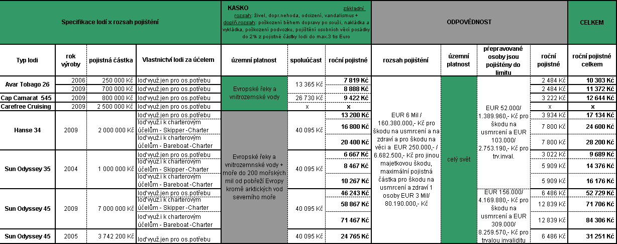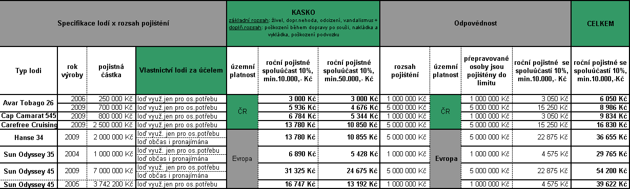 Jak je vidět, problémů je celá řada, a proto je určitě výhodné se o možnostech kvalifikovaně informovat předem. Abychom vám trochu usnadnili situaci, rozhodli jsme se provést krátký průzkum trhu a připravili pro zajímavost k nahlédnutí přehled nabídek na pojištění několika námi vytipovaných lodí, a to od tuzemského a zahraničního pojistitele, jehož výsledkem je orientační srovnávací tabulka. Přesvědčte se sami, jaké velké rozdíly v nabídce rozsahu pojistné ochrany existují.