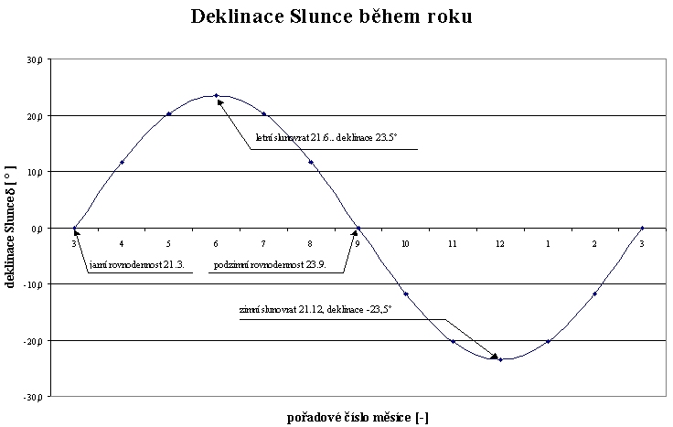 Je pravdou, že když je dostatek času (1 den) lze svoji polohu určit s přesností 20 km pouze pomocí hodinek, provázku a klacíku. Skutečně k tomu není víc zapotřebí. Když ovšem pospícháme najdeme si deklinaci v tabulkách. Je to průběh funkce sinus s maximální funkční hodnotou vyjádřenou ve stupních (23,44° jako maximum), a nezávisle proměnnou je čas (datum), kde celý kruh 360° rozdělíme do 1 roku.