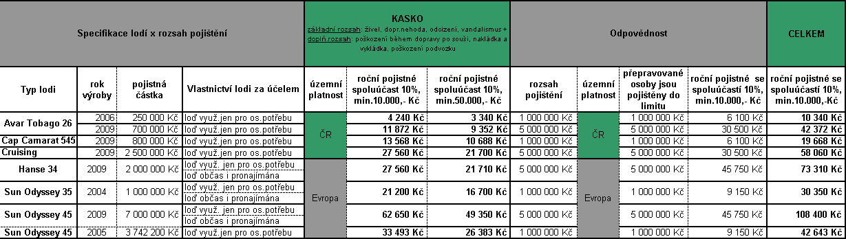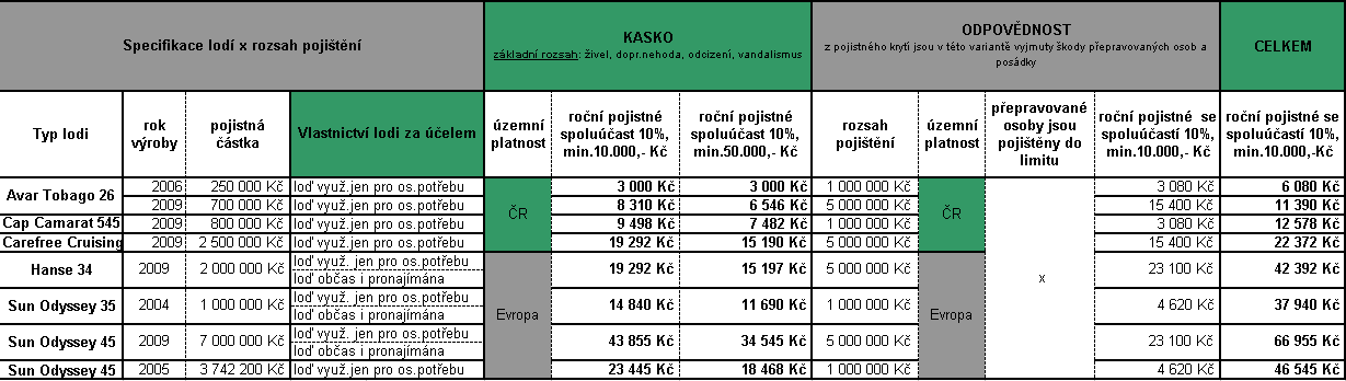 Jak je vidět, problémů je celá řada, a proto je určitě výhodné se o možnostech kvalifikovaně informovat předem. Abychom vám trochu usnadnili situaci, rozhodli jsme se provést krátký průzkum trhu a připravili pro zajímavost k nahlédnutí přehled nabídek na pojištění několika námi vytipovaných lodí, a to od tuzemského a zahraničního pojistitele, jehož výsledkem je orientační srovnávací tabulka. Přesvědčte se sami, jaké velké rozdíly v nabídce rozsahu pojistné ochrany existují.